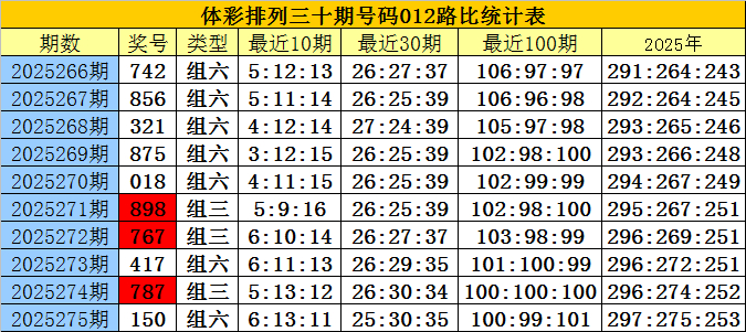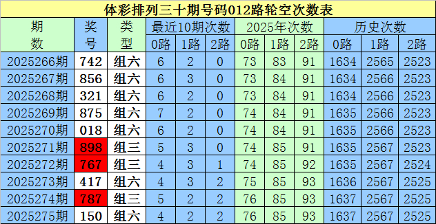 开奖回来:陈设三第2025275期奖号为:150,号码012路比为1:1:1。