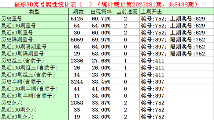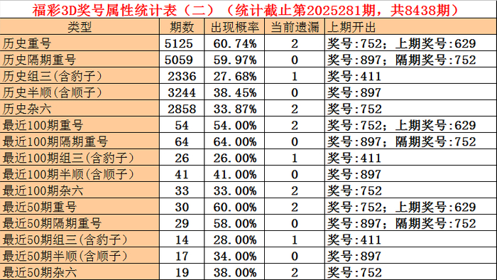 福彩3D第2025279期奖号为752,第2025281期奖号为897,隔期奖号出号7。从统计表平分析,最近100期隔期奖号出现64期,出现比例为64%,最近50期隔期奖号出现29期,出现比例为58%,最近10期隔期奖号出现 4期,出现比例为40%,本期驻守隔期号中号码轮空。