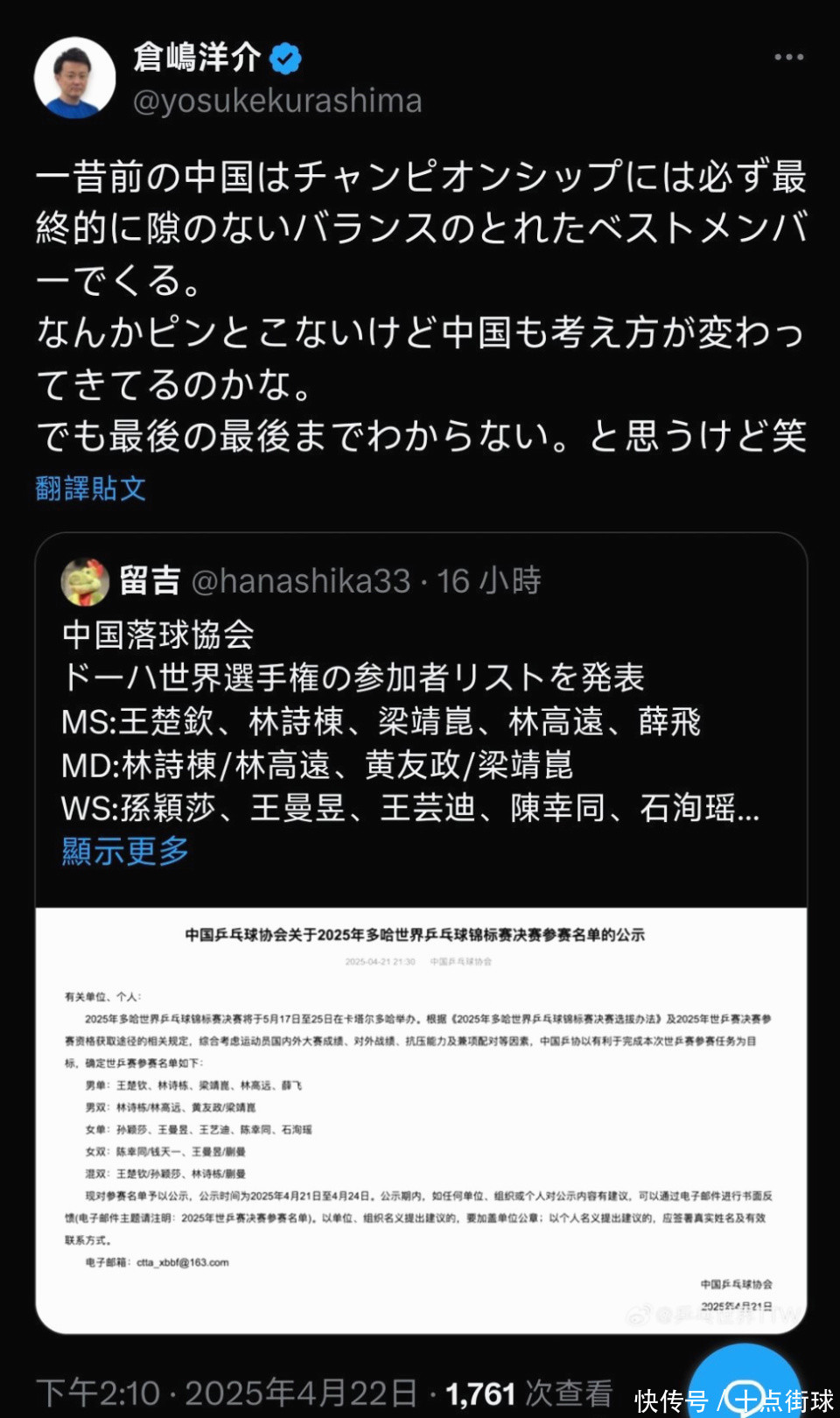 4月21日晚,中国乒协官网公示的多哈世乒赛参赛名单激励公论更正,马龙、樊振东、陈梦三位奥运冠军集体缺席,这一有策动不仅令国内球迷热议,更勾引了日本乒乓球界的怜惜,其中前日本男队主教悔仓岛洋介,就在外交媒体上略带讥诮地说谈:“过去的中国队总所以毫无症结、平衡的最好威望参赛,诚然这次不太看得懂具体原因,但嗅觉中国队的念念维形式正在逐渐改变,比赛(世乒赛)不到临了一刻,谁也不知谈效果会如何,想想还挺兴味的!”